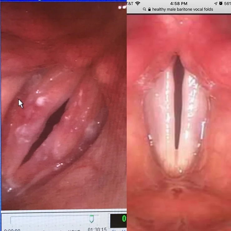 The pictures below are of vocal folds — mine from 2015 — compared to a set of healthy male baritone vocal folds.